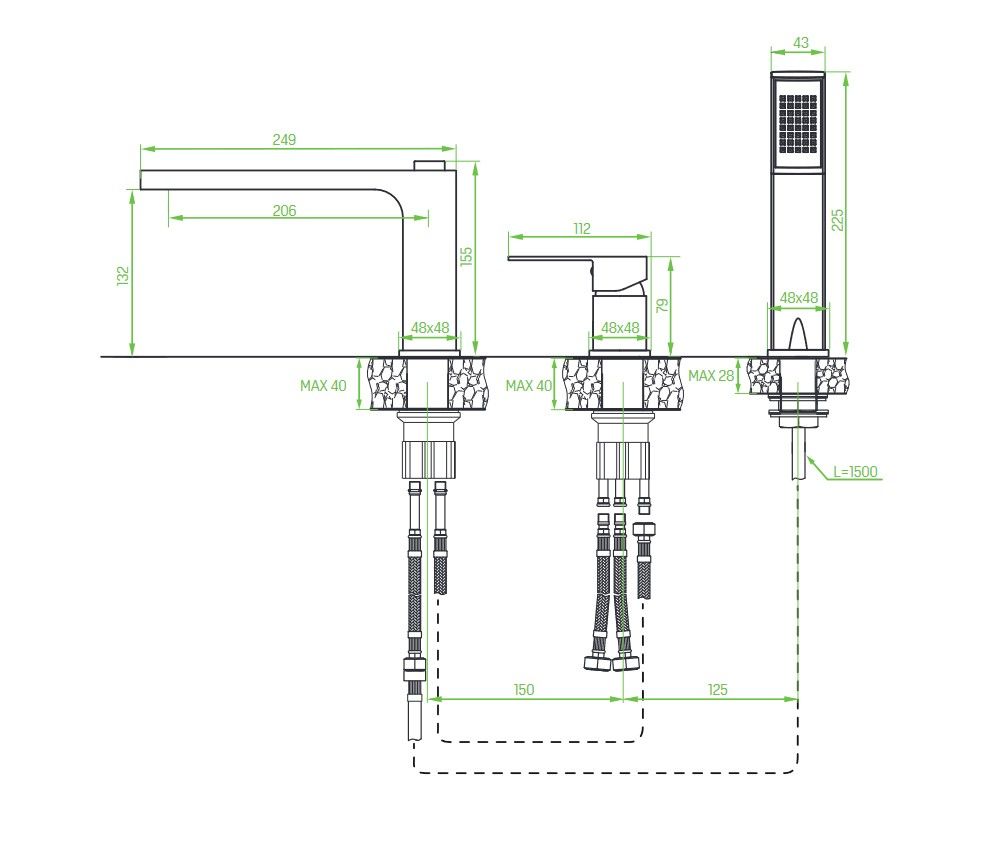 Datorita furtunului ascuns sub suprafața placilor ceramice de la blat, pe care nu trebuie să-l Infasuram în jurul robinetului ca la bateriile clasice, baia este ordonata și estetica. Receptorul robinetului cu trei orificii Kvadrato este echipat cu un sistem anticalcar.  Datorita sistemului anticalcar indepartam rapid și ușor depunerile de calcar lasate de apa dura. Gama mare de duze permite sa umpleți cada in așa fel încat apa sa nu picure pe margini, ceea ce poate cauza pete de apa după o utilizare prelungita.