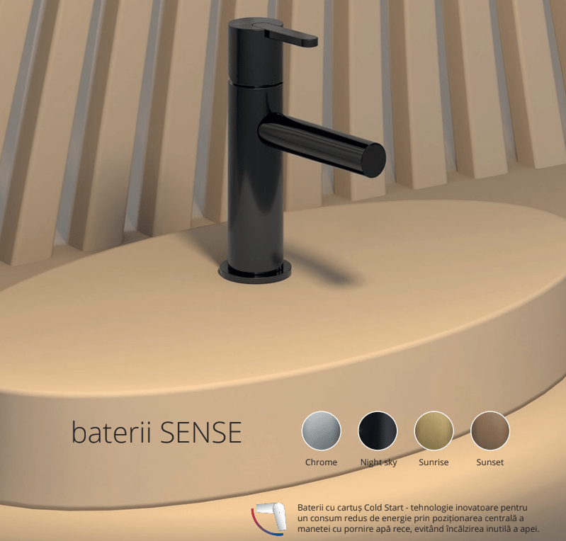 Tehnologia Cold Start: Tehnologie inovatoare pentru cartusele bateriilor. Reduce consumul de energie electrice si prevenirea accidentelor. Bateria porneste doar pe apa rece ( cand levierul este pe mijloc) evitând încălzirea inutilă a apei. Previne opărirea copiilor, bătranilor, persoanelor cu dizabilitati.