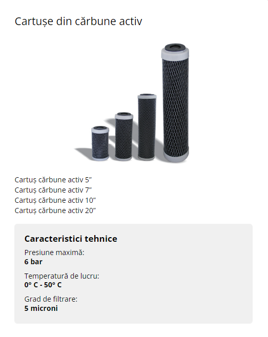 - Bloc de carbune : Fabricat din cărbune activ comprimat, oferind o filtrare mai fină și eliminând particule mai mici.