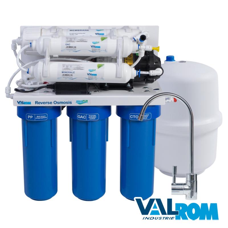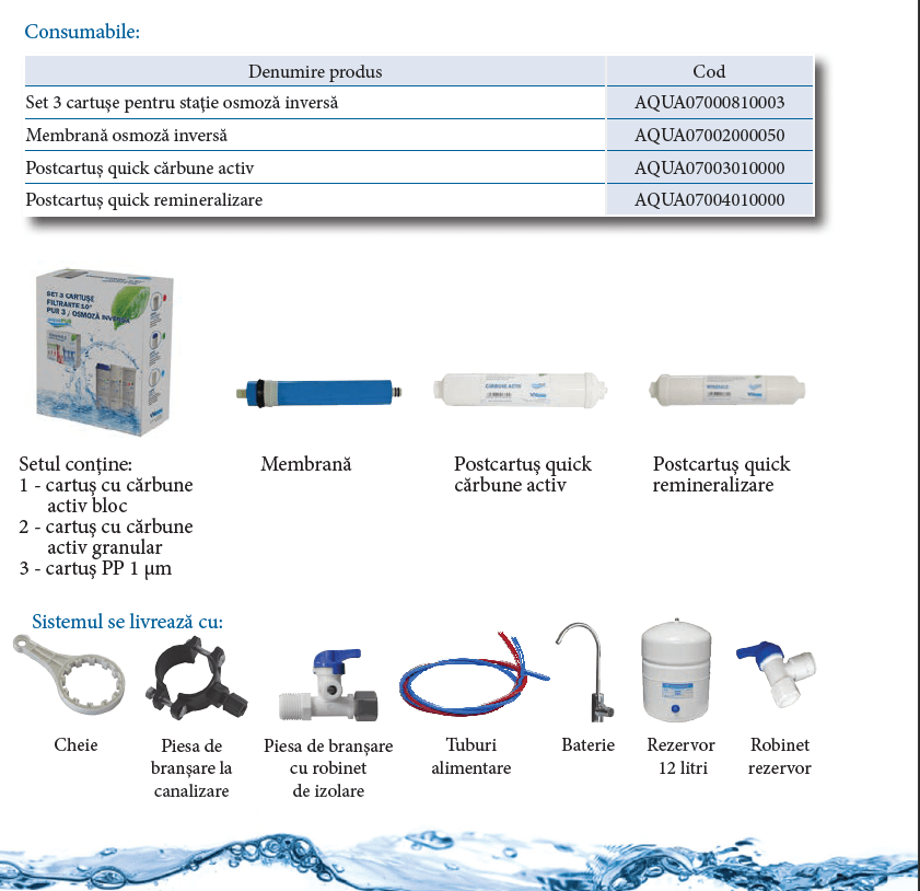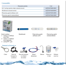 Sistem osmoza inversa tip postcartus Quick, cu 6 filtre, mineralizare, rezrvor 12 litri, baterie pentru chiuveta si pompa. Vezi fisa produs aici. Aviz si declaratie de conformitate.