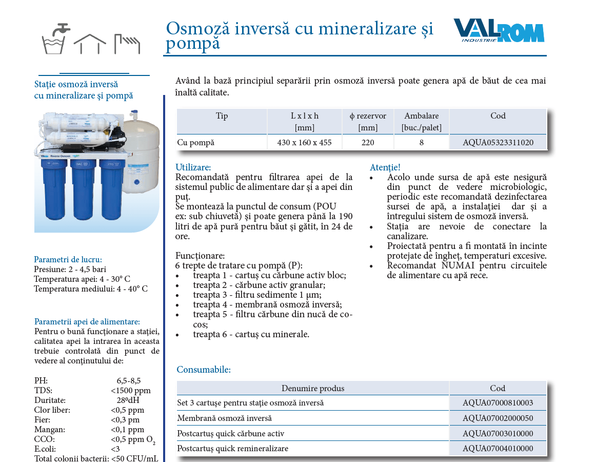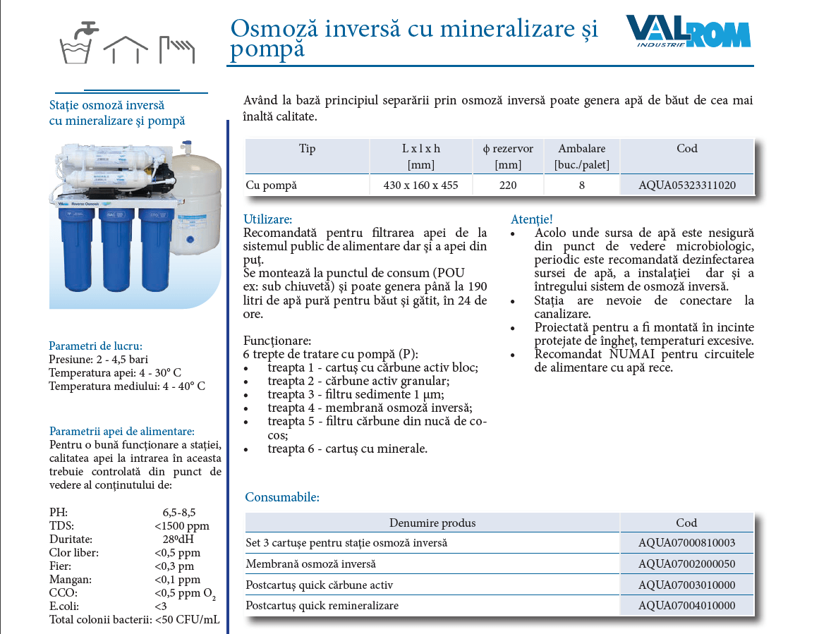 Un sistem de osmoza inversa Valhoh cu 6 filtre, baterie de chiuvetă, rezervor și remineralizare a apei, este un sistem complex de filtrare a apei. Este conceput pentru a oferi apă potabilă de cea mai înaltă calitate, direct de la robinet. Acest tip de sistem osmoza inversa se instalează de obicei sub chiuveta de bucătărie. Este ideal atât pentru consumul casnic, cât și pentru birouri, cabinete medicale sau spații comerciale mici.