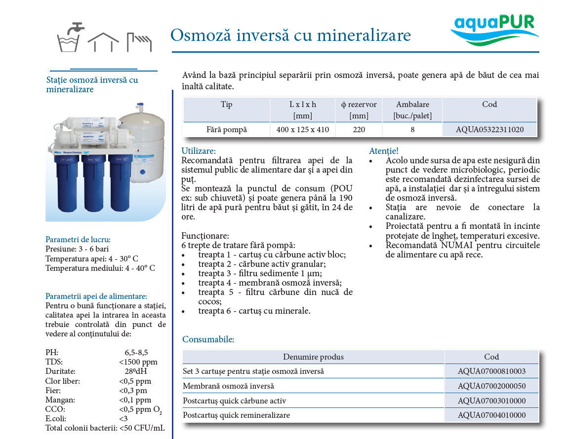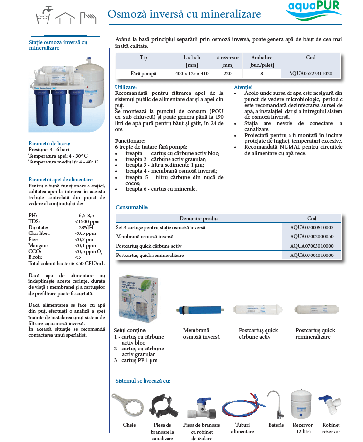 Statie de osmoza inversa tip postcartus Quick, cu 6 filtre, mineralizare, rezrvor 12 litri si baterie pentru chiuveta. Vezi fisa produs aici. Aviz si declaratie de conformitate.