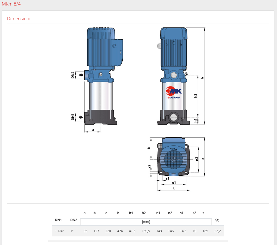 Căutați o soluție fiabilă și eficientă pentru a pompa apa curata dar sa fie si cu montaj vertical? Pompa de suprafata cu montare verticala Pedrollo MK este alegerea perfectă. Este special conceputa pentru a fi montata vertical. Datorită designului său robust și compact, este ideală pentru o gamă largă de aplicații, de la alimentarea cu apă a gospodăriilor până la sisteme de irigații de dimensiuni mici și medii.