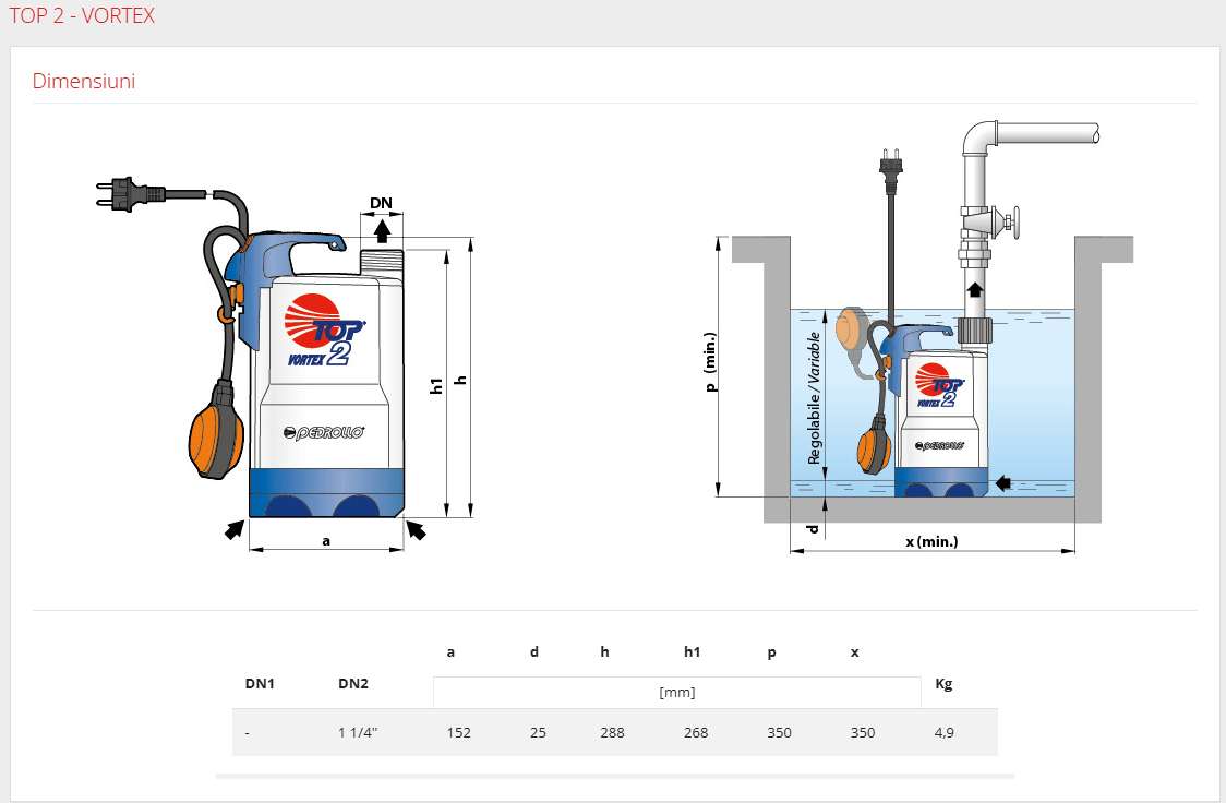 Concluzie: Pompa de apa murdara Pedrollo Vortex Top este o opțiune excelentă și fiabilă pentru aplicații casnice și semi-industriale care necesită pomparea apei murdare cu particule solide de dimensiuni moderate.