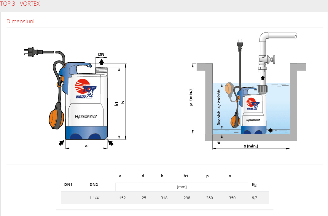 Concluzie: Pompa de apa murdara Pedrollo Vortex Top este o opțiune excelentă și fiabilă pentru aplicații casnice și semi-industriale care necesită pomparea apei murdare cu particule solide de dimensiuni moderate.