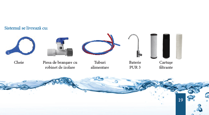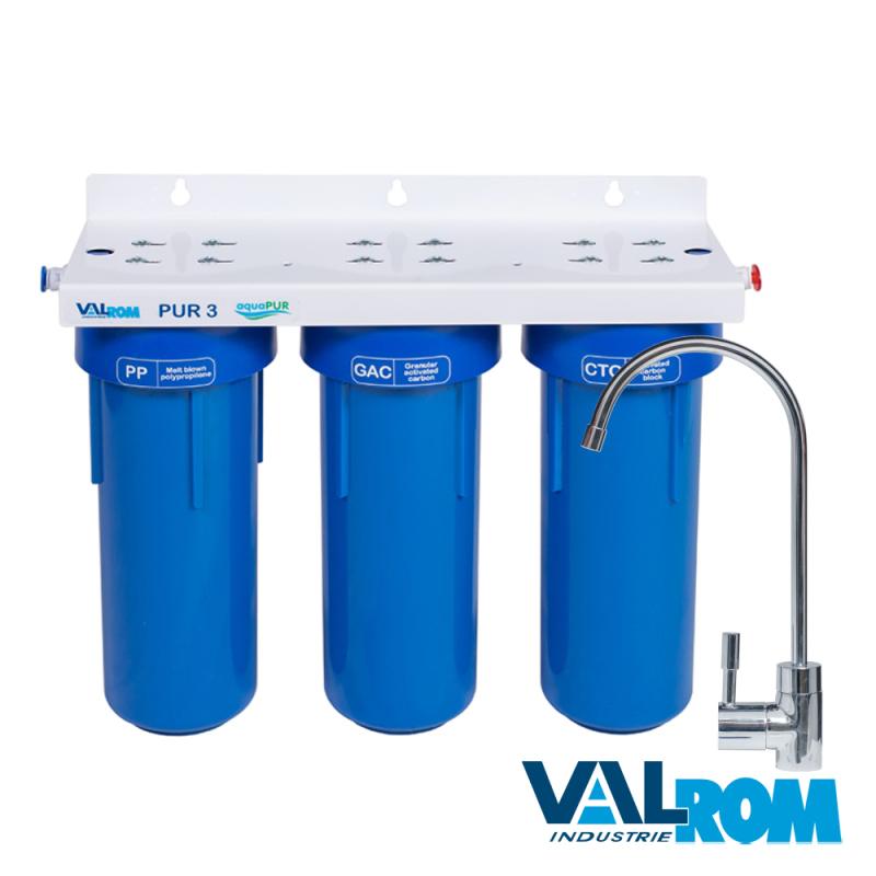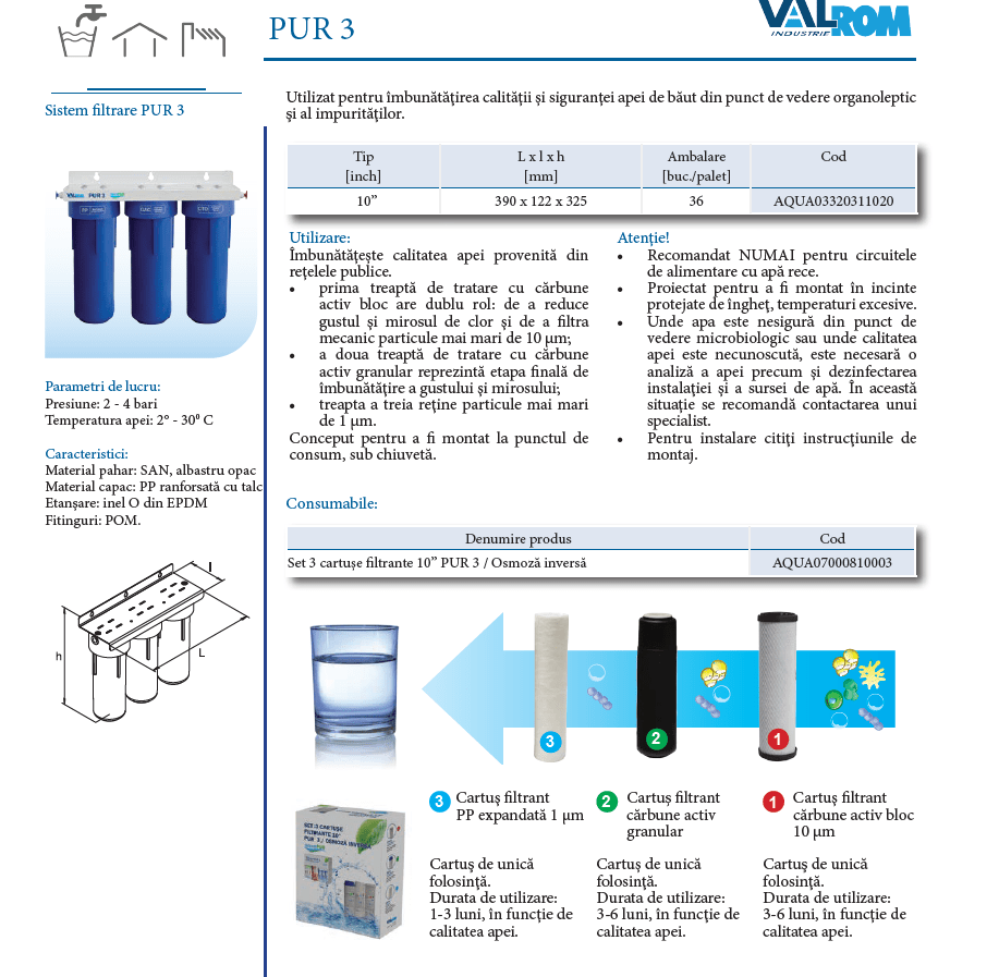 Filtre apa potabila Pur 3 este un sistem de filtrare utilizat pentru imbunatatirea calitatii si sigurantei apei de baut din punct de vedere organoleptic si al impuritatilor. Set filtre apa conceput pentru a fi montat la punctul de consum, sub chiuveta. Atentie! Recomandat NUMAI pentru circuitele de alimentare cu apa rece. Sistem de filtrare apa potabila proiectat pentru a fi montat in incinte protejate de inghet si temperaturi excesive.