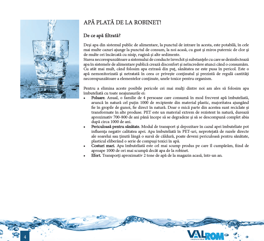 Apa de la robinet provenită din sistemul public de alimentare, NU ar trebui să conțină impurități (nisip, rugină etc.) și nici gust și miros de clor. Datorita rețelelor de transport a apei învechite de la sursă și până la robinet, respectiv a utilizării clorului pentru dezinfecția apei, consumăm, cu sau fără voia noastră, cantități mari din ’’adaosurile’’ menționate mai sus.