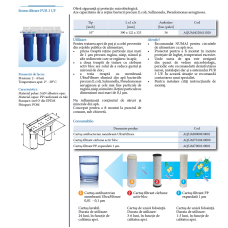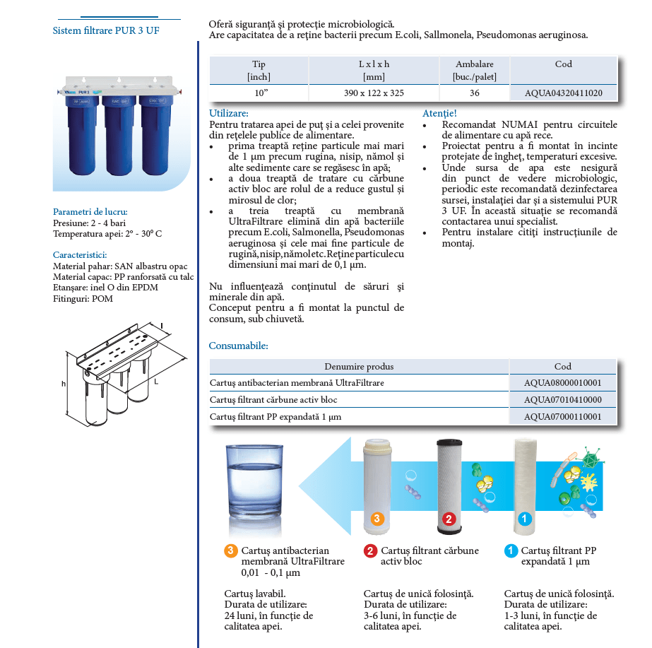 Filtre apa potabila Pur 3UF este un sistem de filtrare utilizat pentru imbunatatirea calitatii si sigurantei apei de baut din punct de vedere organoleptic si al impuritatilor. Set filtre apa conceput pentru a fi montat la punctul de consum, sub chiuveta. Atentie! Recomandat NUMAI pentru circuitele de alimentare cu apa rece. Sistem de filtrare apa potabila proiectat pentru a fi montat in incinte protejate de inghet si temperaturi excesive.