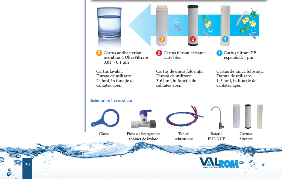 Membrana de ultrafiltrare, cartus de retinere particule de 0.01 – 0,1μm (durata de utilizare maxim 24 luni in functie de calitatea apei).